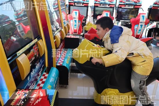 2024年1月1日,小孩子在乌什县“泉域星空”国际滑雪场·四季度假区体验摩托车玩具项目。