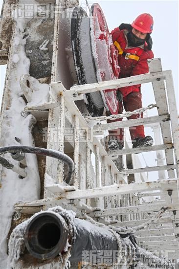 2024年1月2日,中国石油集团新疆油田公司小拐油田,西部钻探工程有限公司准东钻井公司钻井队队员冒着严寒在井架上维护设备。