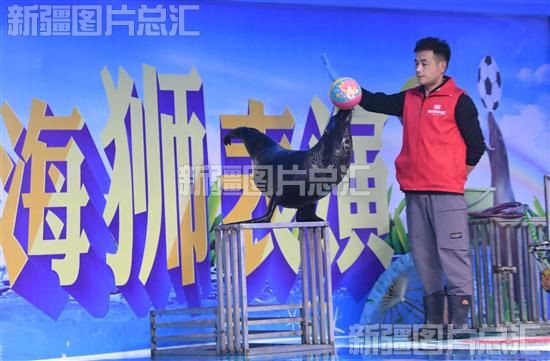 2024年1月2日,博乐市北山海洋馆工作人员引导海狮表演。