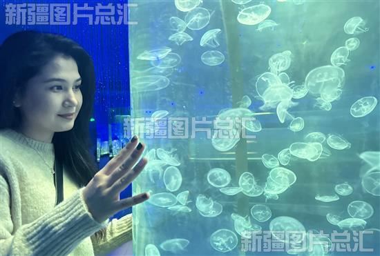 2024年1月2日,游客在博乐市北山海洋馆观看水母。