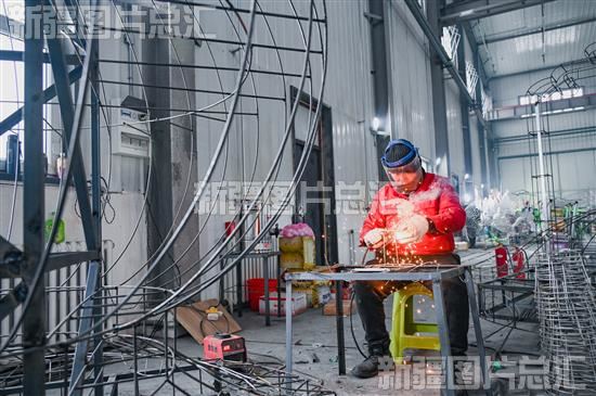 2024年1月4日,在昌吉市城北花灯制作车间,工人正在焊制花灯龙骨。