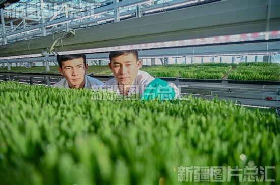 2024年1月6日,位于呼图壁县石梯子哈萨克族乡白杨河村的新疆农业职业技术学院水培牧草示范基地,工作人员正在查看牧草长势。