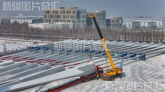 2024年1月9日,机械设备在新疆成飞新材料有限公司风机叶片生产基地吊装风机叶片。