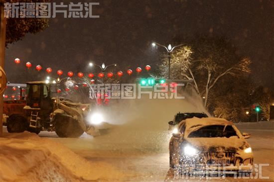 2024年1月9日晚,清雪设备在阿勒泰市的城市道路上清扫积雪。