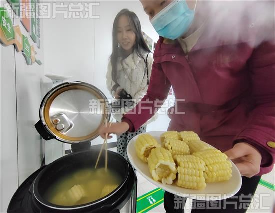 2024年1月11日,新疆玉维鲜农业科技中心工作人员在蒸煮鲜食甜糯玉米。