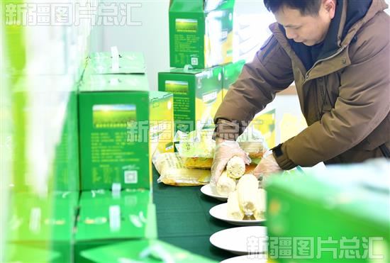 2024年1月11日,新疆玉维鲜农业科技中心工作人员在摆放鲜食甜糯玉米。