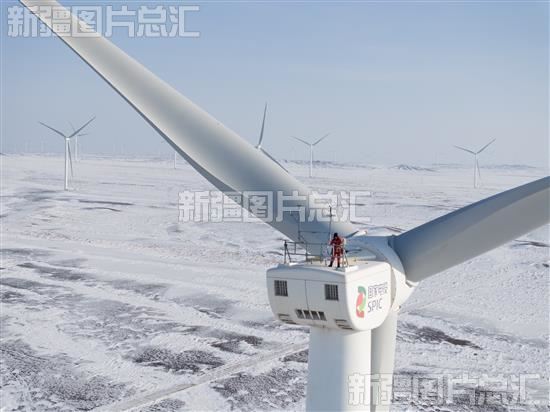 2024年1月13日,中电投集团新疆能源化工木垒新能源有限公司工作人员在木垒老君庙风电场检修风机。
