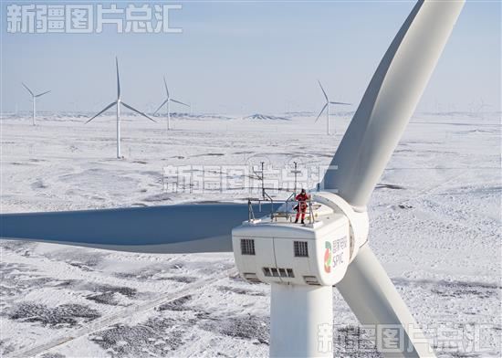2024年1月13日,中电投集团新疆能源化工木垒新能源有限公司工作人员在木垒老君庙风电场检修风机。