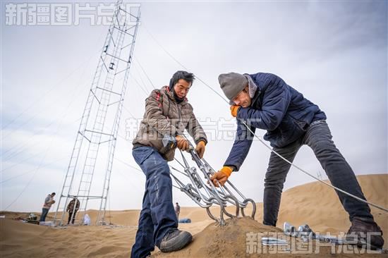 2024年1月14日,工人在塔克拉玛干沙漠中心地带的一号公路边架设通讯信号塔(无人机摄)。