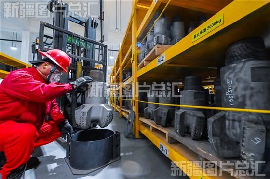 2024年1月15日,工人在位于克拉玛依市的新疆帝陛艾斯钻头工具有限公司生产车间转运钻头。