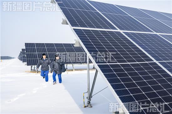 2024年1月14日,木垒县光伏产业园,运维技术人员在监测、检测设备运行情况。