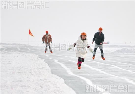 2024年1月14日,游客在博湖县博斯腾湖景区体验冰刀比赛。
