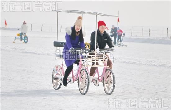 2024年1月14日,游客在博湖县博斯腾湖景区体验冰上自行车。