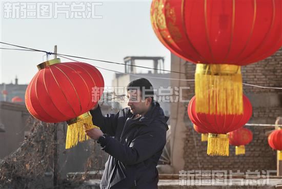 2024年1月16日,喀什古城社区干部在帮助居民挂灯笼,营造节日氛围。