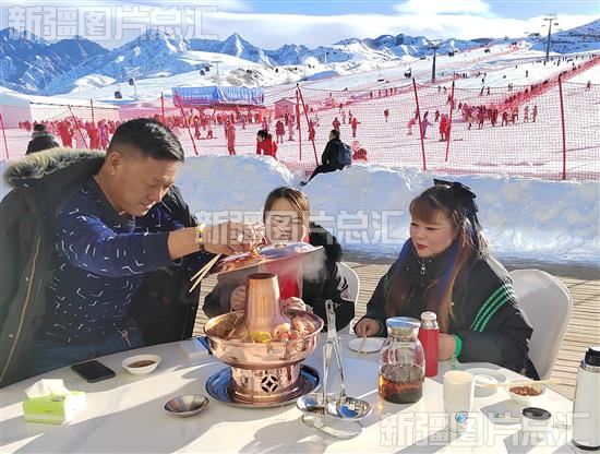 2023年12月22日,游客在阜康市天山天池国际滑雪场休闲区吃火锅。