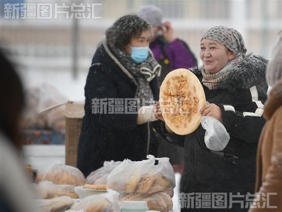 2023年12月21日,木垒哈萨克族自治县大南沟乌孜别克族乡举行哈萨克族传统“冬宰节”,图为商家在活动现场展示特色馕。