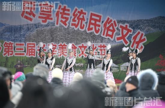 2023年12月21日,木垒哈萨克族自治县大南沟乌孜别克族乡举行哈萨克族传统“冬宰节”,图为活动现场舞蹈表演。