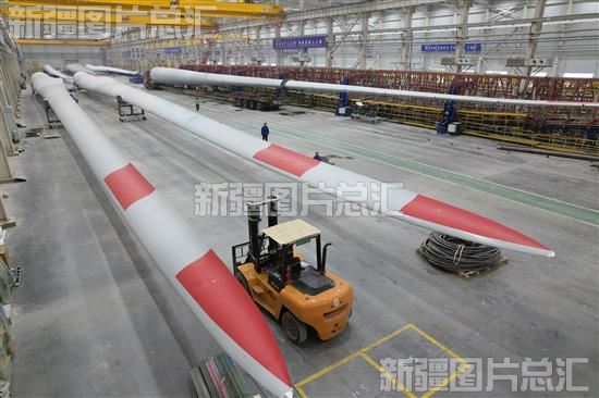 2023年12月21日,在新疆东方风电新能源有限公司车间里,工作人员在巡检刚完工的风机叶片。