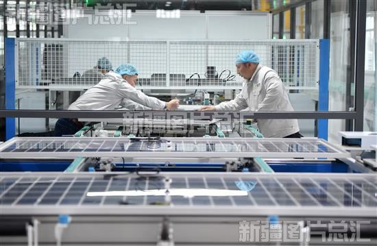 2023年12月21日,工作人员在木垒县海泰新能科技股份有限公司查看设备生产光伏产品。