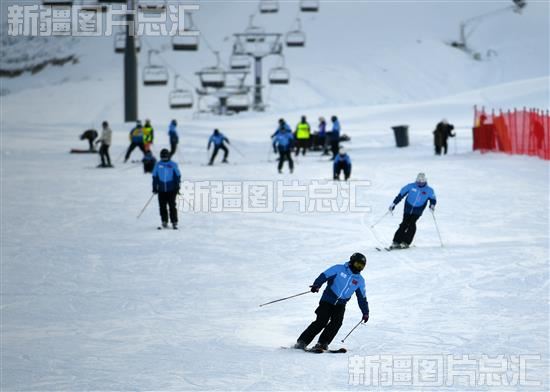 2023年12月22日,游客和滑雪教练在阜康市天山天池国际滑雪场滑雪。