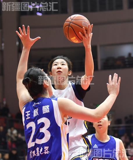 2023年12月17日,新疆女篮队员李一凡篮下强攻后投篮。