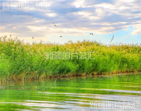 2023年9月16日,海鸥在博湖县博斯腾湖芦花港景区芦苇荡上空飞翔。