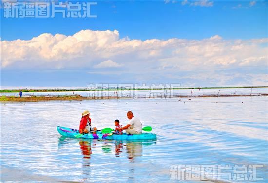 2023年9月16日,游客在博湖县博斯腾湖芦花港景区划船游玩。