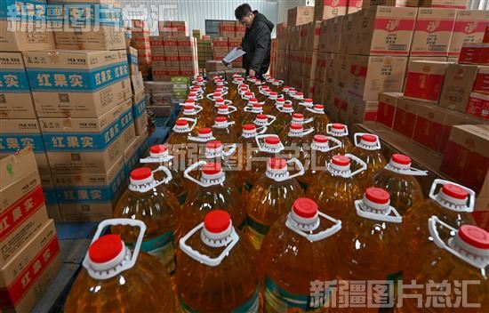 2024年1月17日,克拉玛依红果实生物制品有限公司员工在库房检查准备出厂的食用油产品。