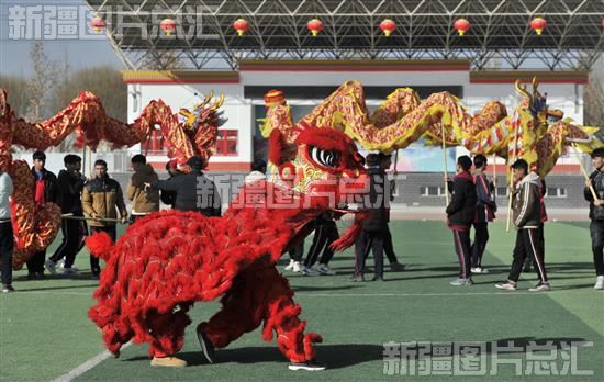 2024年1月19日,疏附县一中学生正在进行舞龙舞狮表演。