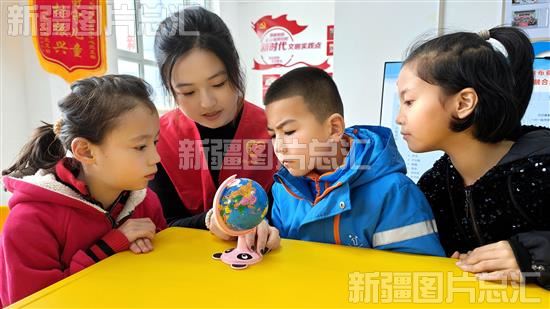 2023年12月16日,在察布查尔镇“石榴籽小课堂”内,来自盐城师范学院城市与规划学院的支教大学生志愿者给孩子们讲地理课。