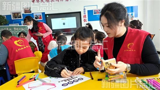 2023年12月16日,在察布查尔镇“石榴籽小课堂”内,支教大学生志愿者教孩子们设计手抄报。