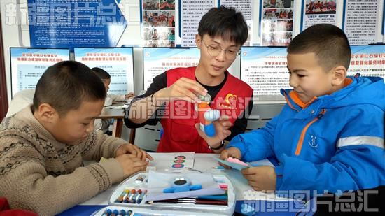 2023年12月16日,在察布查尔镇“石榴籽小课堂”内,来自盐城师范学院实习支教大学生志愿者教孩子们用橡皮泥捻小动物造型,让孩子们在动手动脑中体验创作的乐趣。