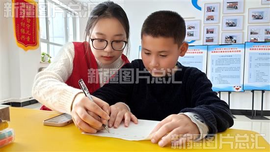 2023年12月16日,在察布查尔镇“石榴籽小课堂”内,支教大学生志愿者教孩子们设计手抄报。