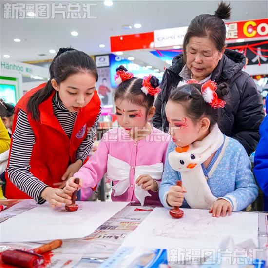 2024年1月14日,小朋友在志愿者的指导下学习拓印生肖。
