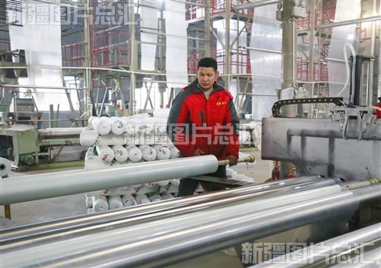 2023年12月7日,工人在位于库车经济技术开发区的库车天科地膜厂生产农用地膜。