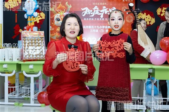 当日,乌鲁木齐市第五十九小学会展校区师生通过剪纸、做游戏、文艺表演等丰富多彩的活动喜迎新年到来。