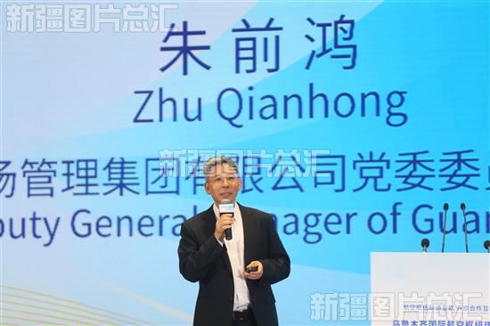 广东省机场管理集团公司党委委员、副总经理朱前鸿做《从广州国际航空枢纽高质量发展之路看乌鲁木齐航空枢纽建设》主题演讲。