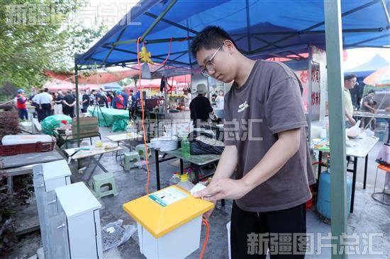 2023年6月7日,阿克苏市夜市上,商贩正在使用共享电源。