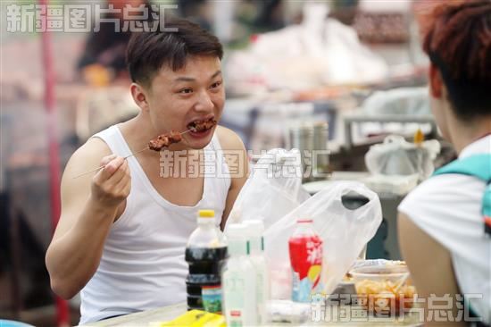 2023年6月7日,阿克苏市夜市上,游客正在品尝美食。