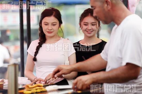 2023年6月7日,阿克苏市夜市上,游客正在购买美食。