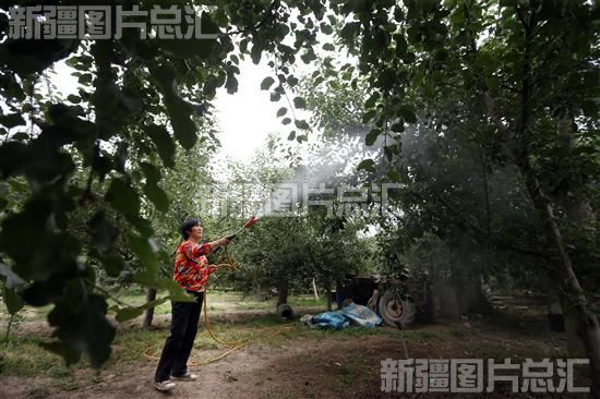 2023年6月8日,阿克苏地区红旗坡农场,果农通过手机扫码共享电源后,给果园打药。