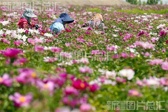 2023年5月18日,天山花海国家农业产业园,工作人员正在为芍药花除草。