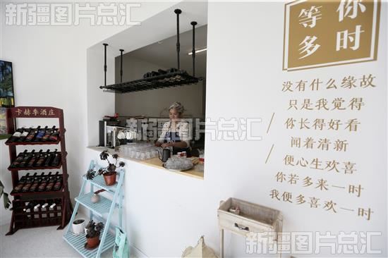 2023年5月17日,芦草沟镇晃晃村,工作人员在民宿里整理饮品台。