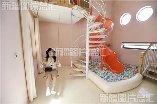 2023年5月17日,游客在芦草沟镇晃晃村民宿的亲子房里玩耍。