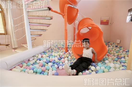 2023年5月17日,小朋友在民宿的亲子房里玩耍。