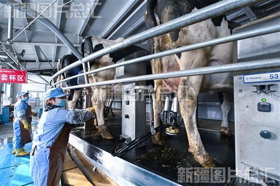 在位于克拉玛依国家现代农业示范区的,克拉玛依市绿成农牧业投资发展公司奶牛养殖基地挤奶厅,一头头黑白花奶牛在工作人员的引导下有序走上自动转盘式挤奶机,鲜奶开始顺着真空管道流入奶罐。 该公司于去年10月全面投运的自动转盘式挤奶机,极大地缩短了挤奶时间,减少了人工成本,提高工作效率,截至2024年1月20日,已经生产鲜奶近5000吨。