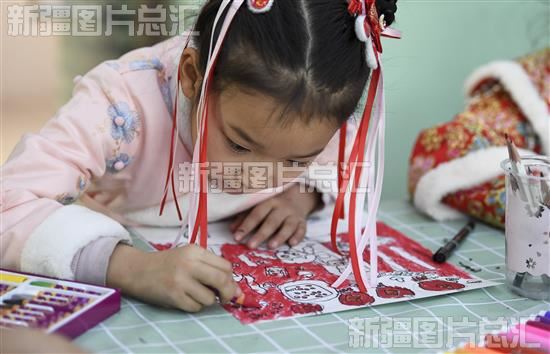 当日,在喀什市夏马勒巴格镇喀什大学实践教学基地的一间绘画教室里,30多名孩子正在描绘龙年春节主题年画。一幅幅充满童趣的年画融入了孩子们对新年的向往和憧憬,也寄托着他们的梦想。