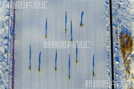 2024年1月23日,克拉玛依市克拉玛依区龙山滑雪场,小选手们脚踩滑雪板在雪道激情飞驰,在阳光的照射下,他们的影子印在雪道上,犹如追影者(无人机摄)。
