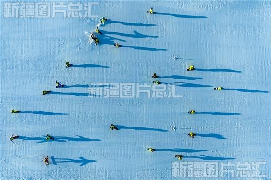 2024年1月23日,克拉玛依市克拉玛依区龙山滑雪场,小选手们脚踩滑雪板在雪道激情飞驰,在阳光的照射下,他们的影子印在雪道上,犹如追影者(无人机摄)。