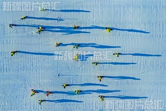 2024年1月23日,克拉玛依市克拉玛依区龙山滑雪场,小选手们脚踩滑雪板在雪道激情飞驰,在阳光的照射下,他们的影子印在雪道上,犹如追影者(无人机摄)。